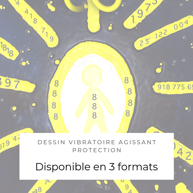 C’est un dessin agissant de protection qui par sa vibration agit comme un bouclier. De plus, il modifie grâce à ses ondes de formes, sa vibration, ses couleurs mais aussi les séries numériques qu’il porte les vibrations et connexions radiantes. Le dessin protection peut être porté sur soi, placé près de soi ou encore accroché dans un lieu en permanence. Ce dessin peut aussi être utilisé en complément de soin pour les thérapeutes en énergétique ou soins alternatifs.