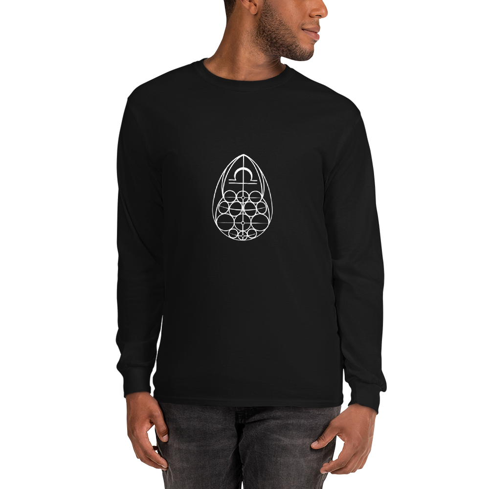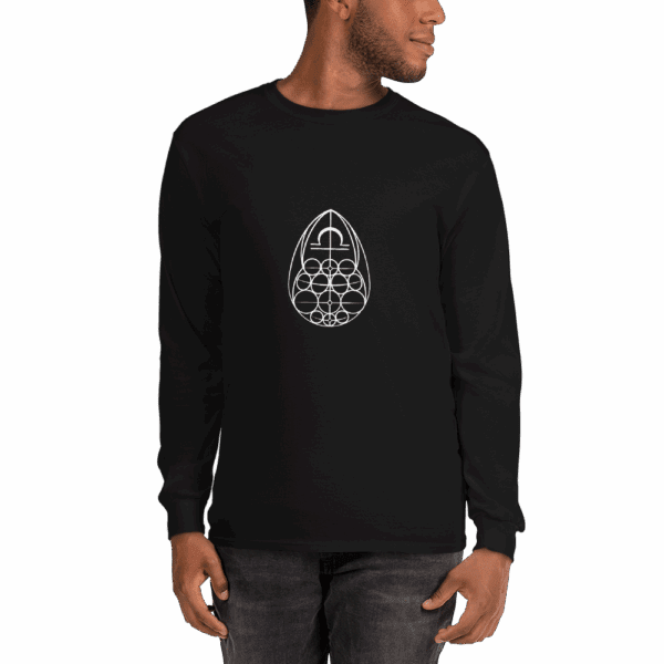 T-shirt à manches longues 100 % coton, orné d’un logo spirituel vibrant, créé par dessin vibratoire et écriture automatique. Style, confort et énergie.